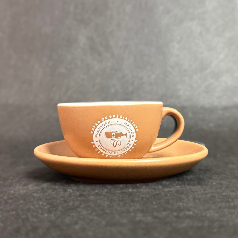 Nu te lăsa înșelat de dimensiunile ei, ci admirează cum eleganța culorii roz-portocaliu (piersică) îmbracă cu delicatețe fiecare colț al acestei cești. Logo-ul subtil al „Camerei cu Cafea” își păstrează locul de onoare, adăugând un element de recunoaștere și autenticitate în timp ce te afunzi în aromatele tale preferate.